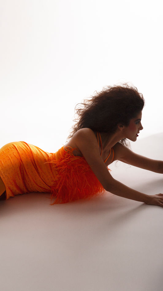 EXTREMELY FEMININE FABRICS AND MATERIALS LIKE ORANGE SILK AND FEATHERS, IN CONTRAST WITH BIG SHOULDERS AND DEEP CUTS, SHOWS THE DESIRE AND THE EROTIC EXPRESSION.